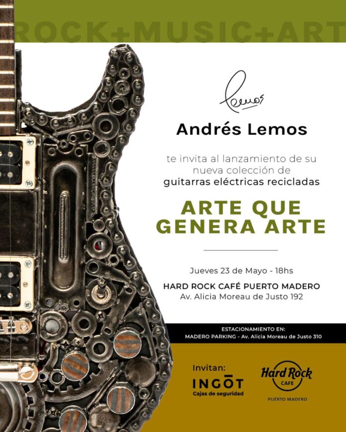 Andrés Lemos, el destacado artista y escultor argentino, presenta “Arte que genera Arte”, el jueves 23 de mayo a las 18 hs. en el Hard Rock Cafe de Puerto Madero, Alicia Moreau de Justo 192, en el lanzamiento de su nueva colección de guitarras electricas recicladas.