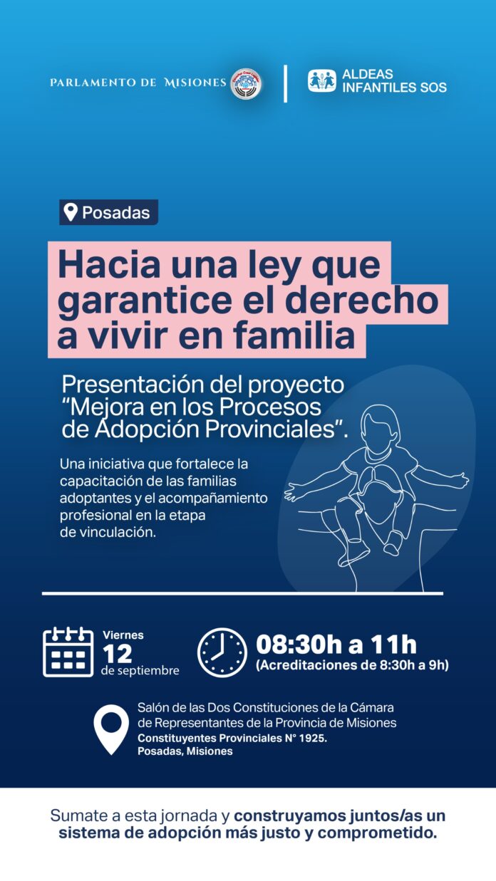 Aldeas Infantiles SOS Argentina, organización referente en atención directa y personalizada a niños, niñas, adolescentes y jóvenes sin cuidado parental o en riesgo de perderlo, invita a participar de la presentación del proyecto de ley “Mejora en los Procesos de Adopción Provinciales”, que se realizará en la ciudad de Posadas el viernes 12 de septiembre, de 08:30 a 11:00 horas, en el Salón de las Dos Constituciones de la Cámara de Representantes de la Provincia de Misiones, ubicado en Constituyentes Provinciales Nº 1925.