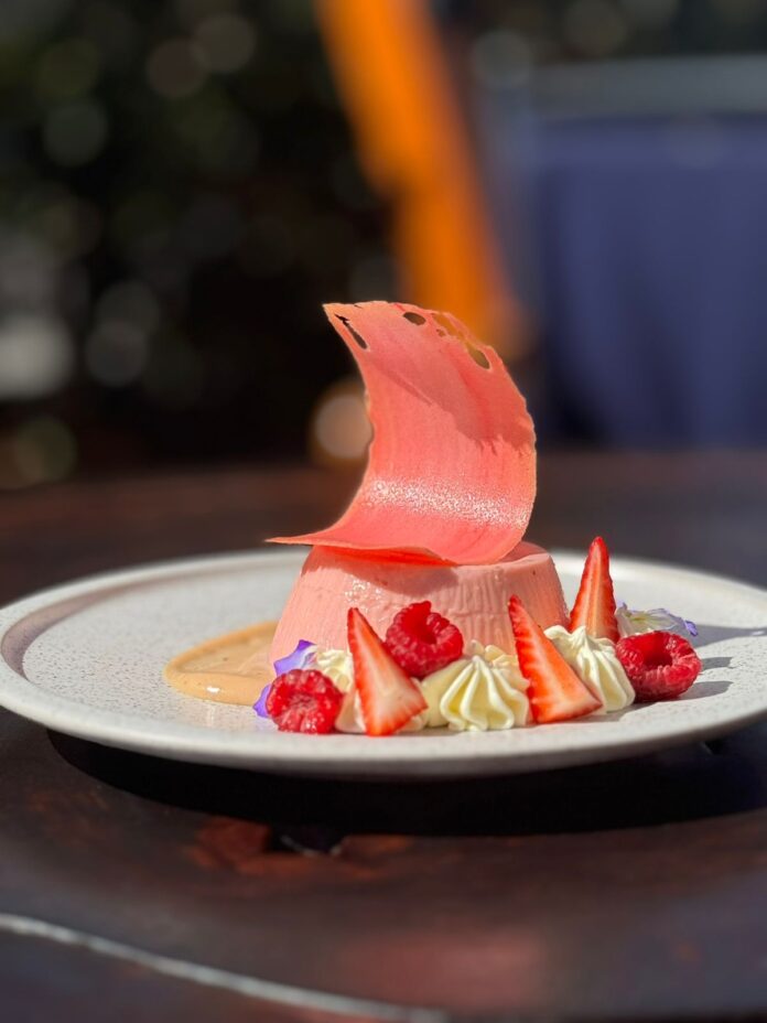 Se trata del postre “Pannacotta de frutilla con corazón de frambuesa y crema inglesa al cardamomo”.