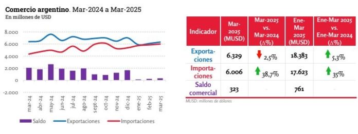 En paralelo, las importaciones fueron de USD 6.006 millones en mar-2025, el mayor valor registrado desde oct-2024, explicado por un aumento de 47,5% en las cantidades importadas, mientras que los precios disminuyeron 6%.