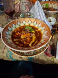 Esos sabores son los que nos enamoraron hace unos días, comenzando con un vino tinto caliente, con pequeños trozos de manzana, para acompañar el Samsa de Cordero, y los patos que luego irían llegando para degustar como el Tashkent, de un suave sabor que le da la combinación de Lengua de Vaca y Pepino Crocante, o el Lagman, una sopa tradicional de fideos estirados a mano con verduras frescas y carne tierna con especias orientales que le dan un sabor único,
