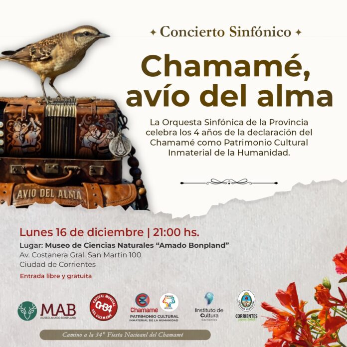 El Gobierno de Corrientes a través del Instituto de Cultura, invitan al concierto “Chamamé, avío del alma”, que brindará la Orquesta Sinfónica de la Provincia en el marco de los festejos por cumplirse 4 años de la declaración del Chamamé como Patrimonio Cultural Inmaterial de la Humanidad, por parte de la Organizacón de las Naciones Unidas para la Educación, la Ciencia y la Cultura (UNESCO, por sus siglas en inglés). Se presentará este lunes a las 21 horas, en el Museo de Ciencias Naturales “Amado Bonpland” (ubicado sobre avenida Costanera General San Martín 100), con acceso libre y gratuito.