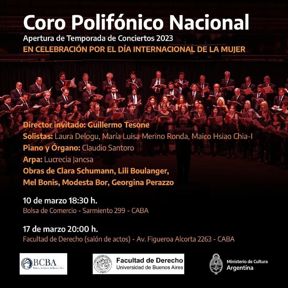 Comienza la Temporada de Conciertos 2023 del Coro Polifónico Nacional, dependiente de la Dirección Nacional de Elencos Estables del Ministerio de Cultura de la Nación, con una conmemoración por el Día Internacional de la Mujer el próximo 10 de marzo a las 18:30 horas en la Bolsa de Comercio y 17 de marzo a las 20 horas en el Salón de Actos de la Facultad de Derecho, en ambos casos en la Ciudad Autónoma de Buenos Aires.