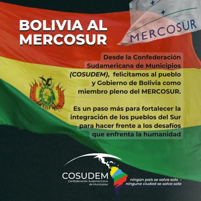 El licenciado Juan Matteo, Presidente de COSUDEM, felicitó al Estado Plurinacional de Bolivia, por haber alcanzado el estatus de miembro pleno del Mercosur, un anhelo largamente soñado y buscado por el país hermano y sus representantes en conjunto con el resto de los mandatarios de la Región.