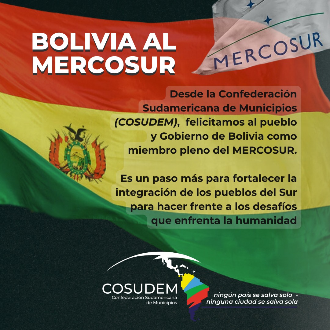 El Presidente de la Confederación Sudamericana de Municipios, expresó al pueblo boliviano, el total apoyo y satisfacción de la enrtidad que representa a las alcaldías de toda la región, por este nuevo paso histórico hacia la integración plena de los pueblos.