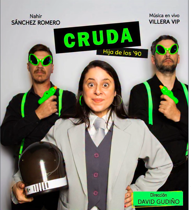 “CRUDA. Hija de los ’90” es la historia de una viajera en el espacio que se dirige hacia la estratósfera prometida y es captada por los marcianos. A través de un interrogatorio contará sin inflación, su década en el uno a uno. Entre canciones desgarradas y coloridas, ropa de feria y altares de santos infinitos expondrá a los seres verdes su herida abierta.