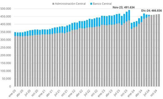 A diciembre de 2024, cerrando el primer año de la gestión actual, la deuda pública bruta consolidada se ubicó en un total de US$466.836 millones, equivalente a US$24.798 millones menos que en noviembre del 2023. Esto significa una reducción del 5% medida en dólares.