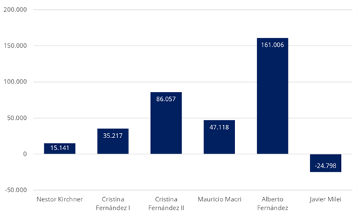 Lo que corresponde es analizar la evolución de la deuda pública consolidada, teniendo en cuenta tanto al Tesoro como al BCRA. Cuando se hace este análisis por presidencia, se observa que el mayor incremento de la deuda pública se dio durante el gobierno de Alberto Fernández, con una suba de más de US$161.006 millones, de los cuales US$112.259 millones correspondieron al Tesoro y US$48.749 millones a la deuda remunerada del BCRA.