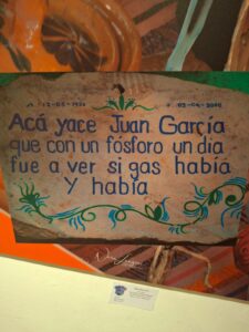 Con respecto a los epitafios que están en los fotos, Lanzieri nos comentó que “En el cementerio de Cancún, en Xcaret, hay tumbas con estos epitafios. Entonces saqué fotos a los epitafios. Y después, en toda la producción fotográfica que yo tenía, me pareció que algunos podían ir con las imágenes” y agregó sobre algunas fotografías que “Tienen intervención digital, que están como degradadas o que son sepiadas. Bueno, hay todo un juego, ¿no? Ya uno empieza a jugar un poco con la obra, porque, si no, sería como muy monótono”.