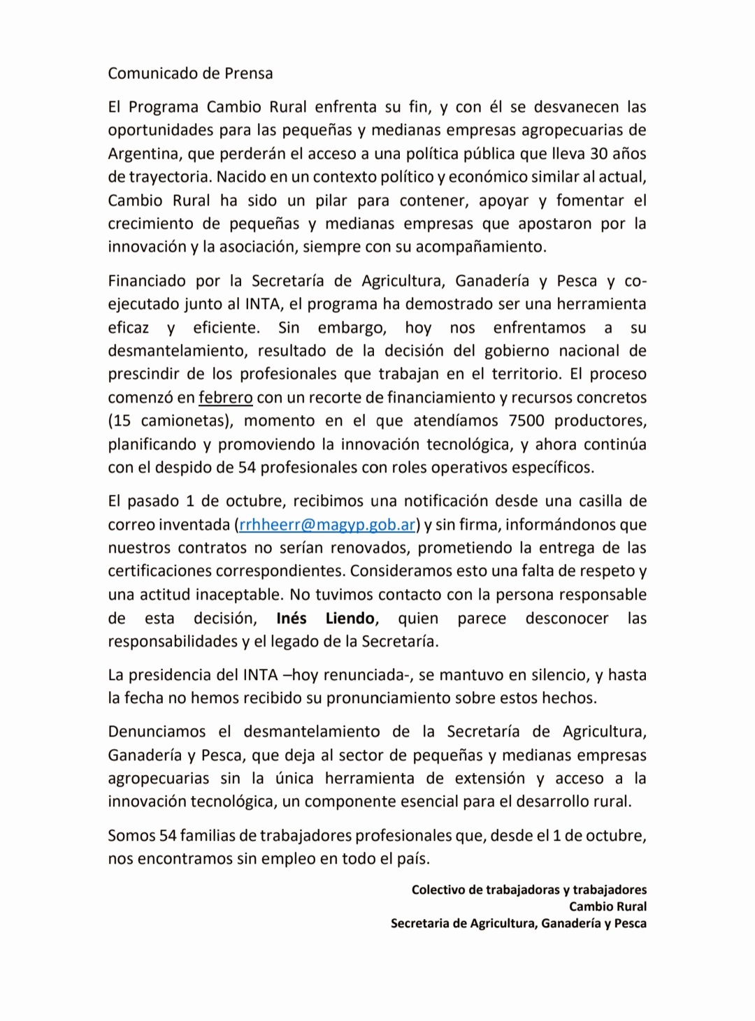 El Colectivo de trabajadoras y trabajadores Cambio Rural emitió un comunicado tras su cierre