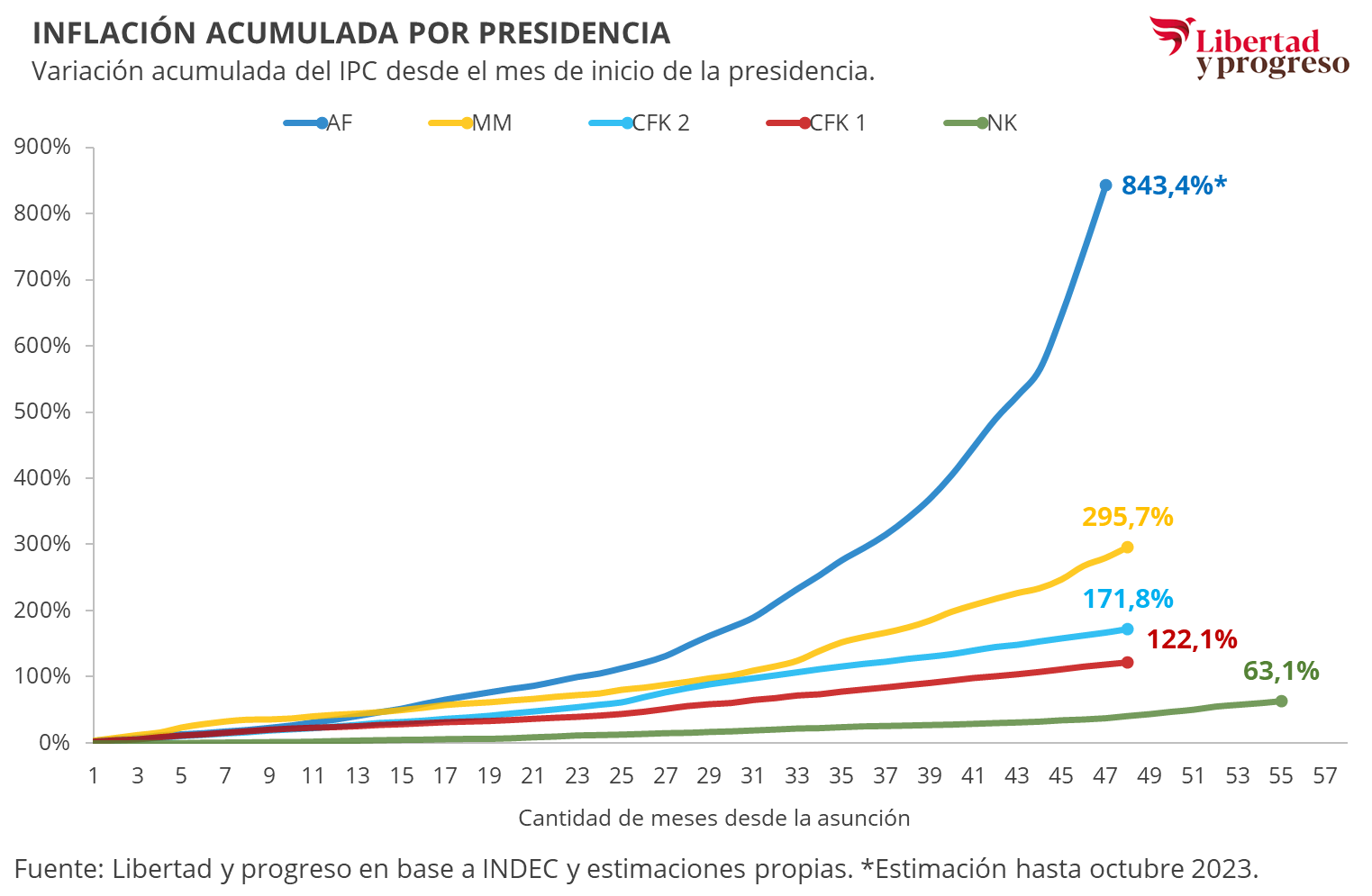 Con esto, la inflación acumulada durante la presidencia de Alberto Fernández es de 843,4%. En los 15 meses bajo los cuales el actual candidato presidencial, Sergio Massa, se encuentra al frente del Ministerio de Economía, el IPC acumula una suba del 202,6%, similar a la inflación acumulada durante los primeros 32 meses de la gestión (211,8%).