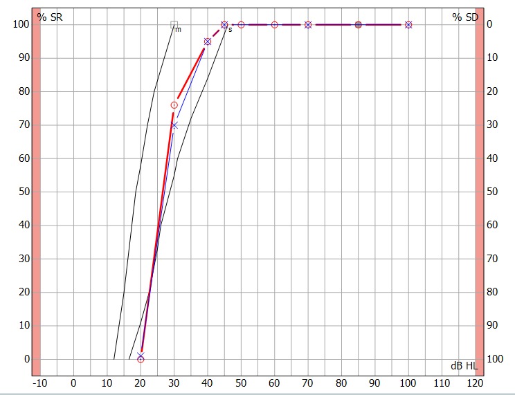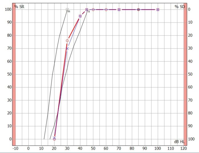Comenzada la prueba, que muchos habrán hecho y él que no, recomiendo que la haga, fui experimentando como mis dos oídos percibían sonidos agudos y graves en distintos volúmenes, siempre primero de un lado y luego del otro; tras los sonidos, vinieron las palabras, de un lado, con ruido ambiente del otro lado, para conocer bien el tipo de audición que tengo.