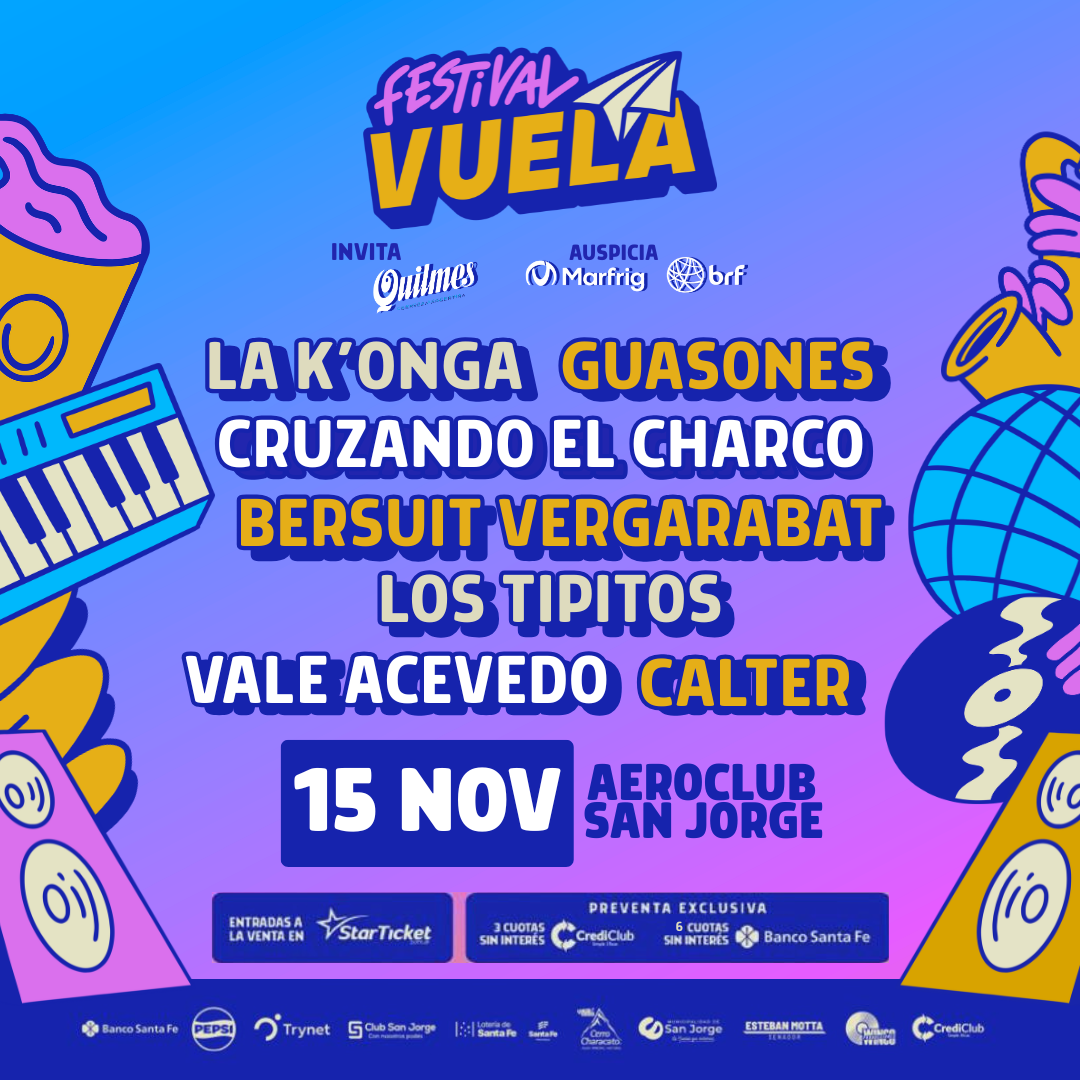 Vuela reúne a los fanáticos de algunos de los artistas más convocantes del país, que pisarán por primera vez el suelo de San Jorge: Bersuit Vergarabat, Guasones, La K’onga, Cruzando el Charco, Los Tipitos, Vale Acevedo, Calter y la Dj Agus Maders.