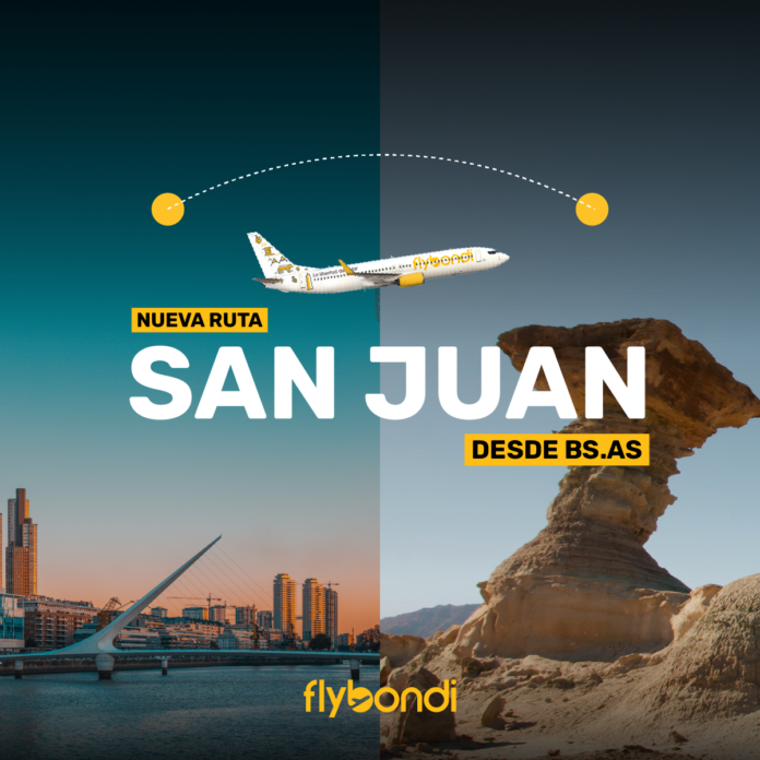 Flybondi, la primera aerolínea low cost de Argentina, continúa con su plan de crecimiento y suma una nueva provincia a su red de conectividad en el país. A partir de septiembre comenzará a volar a San Juan, provincia que desde hace más de 6 años cuenta con una sola oferta aérea. De esta manera, llega para todos los sanjuaninos y sanjuaninas una nueva oportunidad de volar con tarifas bajas.