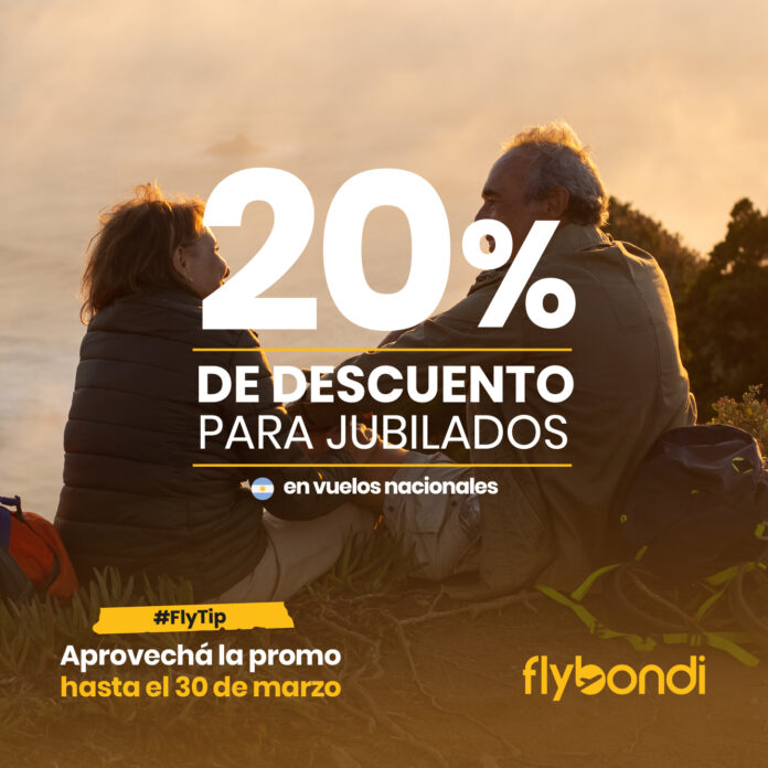 Flybondi, la primera aerolínea low cost de Argentina, continúa con el Programa de Descuentos para personas jubiladas hasta marzo del 2024. Con este beneficio se puede acceder a un 20% de descuento en todos los vuelos nacionales y aplica a todo el calendario disponible de la aerolínea.
