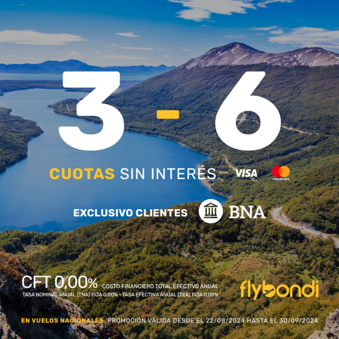 Aquellas personas que estén pensado viajar por Argentina con Flybondi podrán pagar en 3 y 6 cuotas sin interés con su tarjeta Visa o MasterCard del Banco Nación Argentina (BNA). Esta opción está disponible para compras realizadas hasta el 30 de septiembre de 2024, y para volar entre el 4 de septiembre de 2024 y el 1 de julio de 2025.