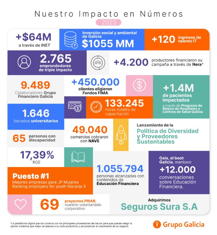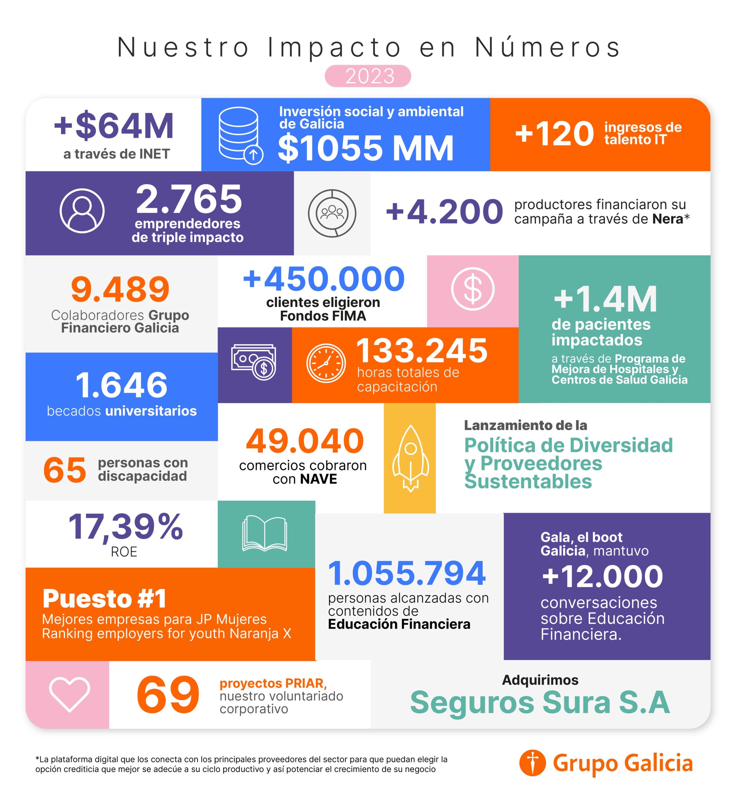 Grupo Galicia, uno de los principales holdings de capitales nacionales del sistema financiero, presenta su Informe Integrado 2023 en donde comunica la gestión económica, social y ambiental de sus compañías Banco Galicia, Naranja X, Galicia Seguros, Fondos FIMA, Galicia Securities, Inviu, Nera y Galicia Ventures.