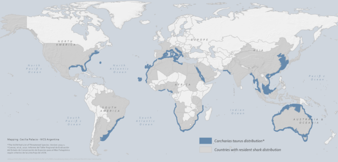 Una situación similar sucede con la población global del tiburón escalandrún (Carcharias taurus): de acuerdo a la Lista Roja de Especies Amenazadas, elaborada por la Unión Internacional para la Conservación de la Naturaleza (UICN), se encuentra en peligro crítico de extinción. Por su naturaleza migratoria, combinada con una fuerte presión pesquera en su área de distribución (a causa de la captura tanto selectiva como incidental en pesquerías artesanales, recreativas e industriales), se estima que su población se redujo en un 80% en los últimos 74 años.  Además, su preferencia por las aguas costeras implica que también su hábitat está amenazado, por la pérdida y degradación de estos ambientes.