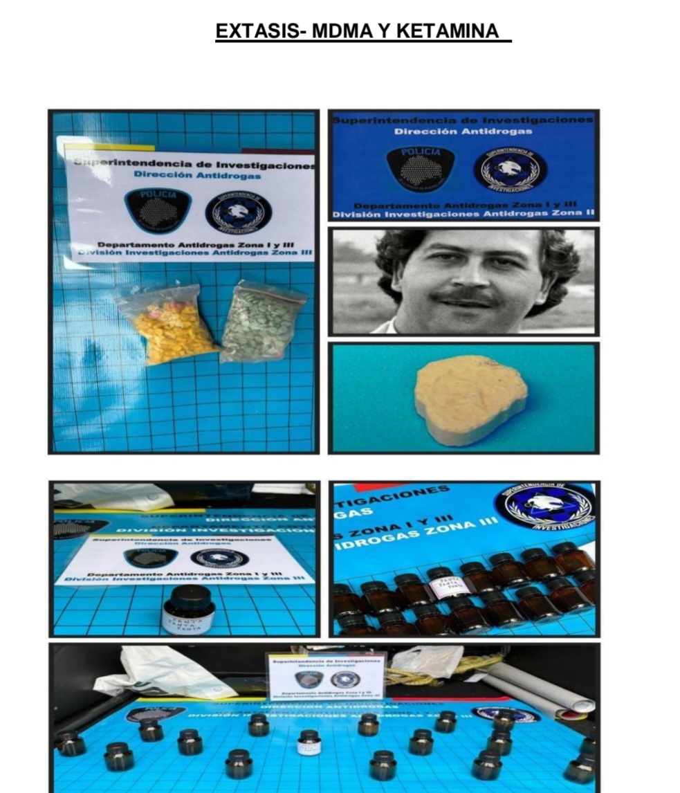 con el ROSTRO de PABLO ESCOBAR, y 16 FRASCOS DE VIDRIO CON KETAMINA LIQUIDA y UN FRASCO DE FENTANILO (tenia inscripción), MARIHUANA Y MDMA EN POLVO, MUCHOS DOLARES Y PESOS NACIONALES, todo valuado en alrededor de 17.000.000 $ millones de pesos, siendo una importante incautación por parte de la Policía de la Ciudad. El poseedor de las sustancias fue detenido y alojado en ALCAIDIAS DE LA CIUDAD. Los reactivos en el lugar arrojaron POSITIVO para las sustancias, a excepción de Ketamina y Fentanilo que deben ser analizados de manera más minuciosa en los laboratorios de la Policía. Se logró saber que en el mercado ilegal el precio per cápita de cada PASTILLA de EXTASIS ronda en los 27.000 pesos y la KETAMINA cada frasco de 50ml rondaría los 60.000 pesos.