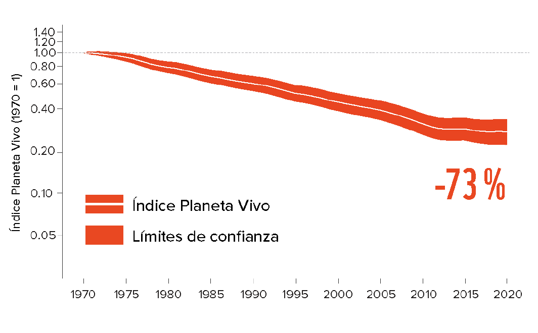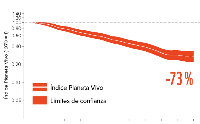 • *El Índice Planeta Vivo muestra una disminución promedio del 73% en las poblaciones de vertebrados silvestres monitoreadas (mamíferos, aves, anfibios, reptiles y peces). El cambio porcentual en el índice refleja el cambio proporcional promedio en los tamaños de las poblaciones animales monitoreadas en sitios de todo el mundo, no el número de animales individuales perdidos ni el número de poblaciones perdidas.