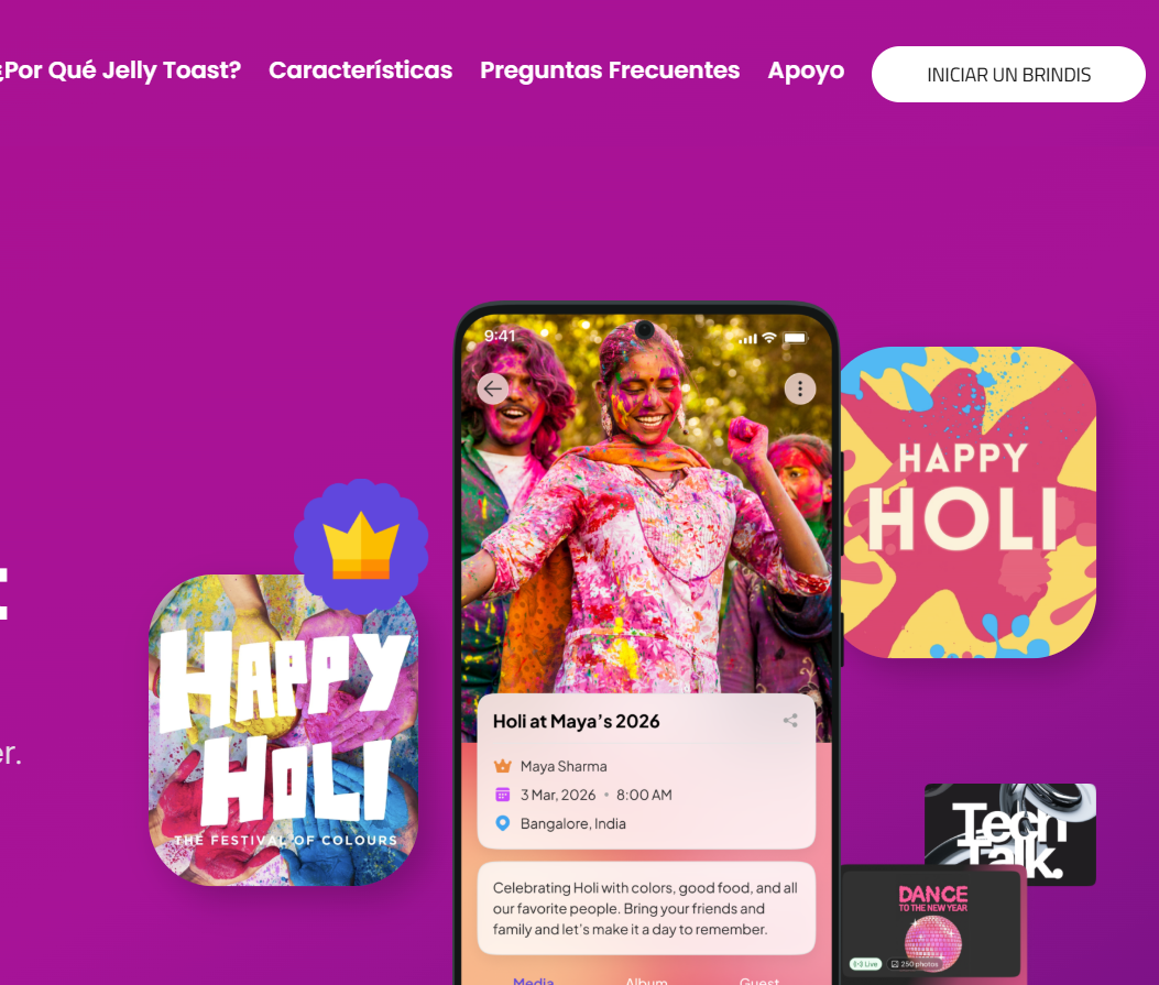 Desde cumpleaños y bodas hasta celebraciones de Holi, festivales universitarios, salidas de oficina, conciertos y viajes de fin de semana, Jelly Toast crea invitaciones, recopila fotos y ayuda a los grupos a revivir momentos compartidos en un solo espacio exclusivo.