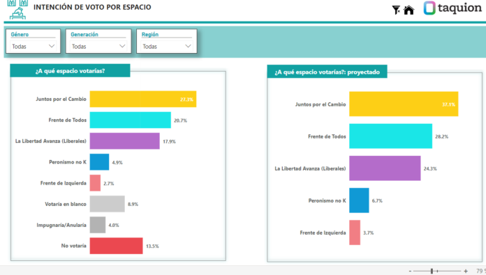Mas allá del importante caudal de electores que se ausentarían a la hora de votar, aquellos que si lo van a hacer eligen, con un 27,%, a Juntos por el Cambio, y un 20,7%, al Frente de Todos, dejando en el tercer lugar con un 17,9%, al partido de Javier Milei, lo que va de la mano con la mala performance que tuvieron sus candidatos en las elecciones provinciales que se han desarrollado hasta el momento.