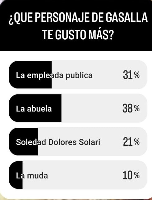 Tras la triste noticia de la muerte de Antonio Gasalla, afloraron en las redes sociales videos e imágenes de sus personajes mas recordados. Le preguntamos a los argentinos cual es el personaje que mas les gustaba y por mayoría, 38%, gano La Abuela, seguida de cerca por la Empleada Publica con el 31%, un poco mas atrás el personaje de Soledad Dolores Solari con el 21% y ya muy lejos, el personaje de La Muda con el 10%.