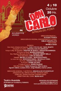 Con dirección musical de Maestra Susana Frangi, dirección de escena, fotografía y luces de Emilio Urdapilleta y vestuario de Mariela Daga, subirán al escenario, además de Graciela de Gyldenfeldt, como Elisabetta de Valois, Pablo Truchljak y Raúl Iriarte, como Don Carlo (Infante de España); Cristian De Marco y Sebastián Barboza, como Felipe II (Rey de España); Mairín Rodríguez, como Princesa de Éboli; Enrique Gibert Mella, como Don Rodrigo (Marqués de Posa); Carlos Esquivel, como Gran Inquisidor; Michelle Fogel y Mercedes Barel, como Tebaldo; Mercedes Barel y Michelle Fogel, como La voce del cielo; Federico Salcedo, como Un Frate; Edwin Salinas, como Un Araldo; Edwin Salinas, como Il Conte di Lerma; además de Jorge Balagna, Fabián Cangueiro, Félix Cordero, Luciano Allievi, Jorge Waddel y Carlos Lafalce, quienes interpretarán a seis diputados.