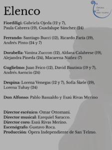 El elenco está integrado por: Gabriela Ojeda (12/10 y 7/11), Paula Cabrera (19/10), Guadalupe Sánchez (24/10) interpretan a Fiordiligi; Santiago Bucci (12/10), Ricardo Faría (19/10), Andrés Pinto (24/10 y 7/11), componen a Ferrando; Vanina Zuccon (12/10), Aldana Calabrese (19/10), Alejandra Pineda (24/10), Macarena Núñez (7/11), encarnan a Dorabella; Juan Feico (12/10), David Bautista (19/10 y 7/11), Andrés Asencio (24/10) interpretan a Guglielmo; Lorena Venegas (12/10 y 7/11), Sofía Škele (19/10), Lorena Tuhay (24/10), interpretan a Despina, y Esaú Rivas Merino y Pablo Basualdo encarnan a Don Alfonso.