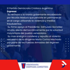 Particularmente alarmante para el partido es el reciente secuestro de la dirigente opositora María Corina Machado, quien fue detenida por las fuerzas armadas del régimen. La Democracia Cristiana condena enérgicamente este acto de violencia, considerándolo un ataque directo a la democracia y a los derechos humanos.