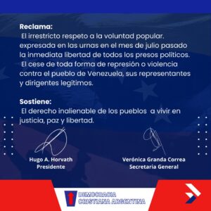 El mensaje finaliza con una afirmación contundente: “Los pueblos tienen un derecho inalienable a vivir en justicia, paz y libertad”. Este pronunciamiento no solo refleja la postura de la Democracia Cristiana Argentina, sino que también se erige como un grito de solidaridad hacia un pueblo que clama por su autonomía y derechos fundamentales en medio de una crisis profunda.