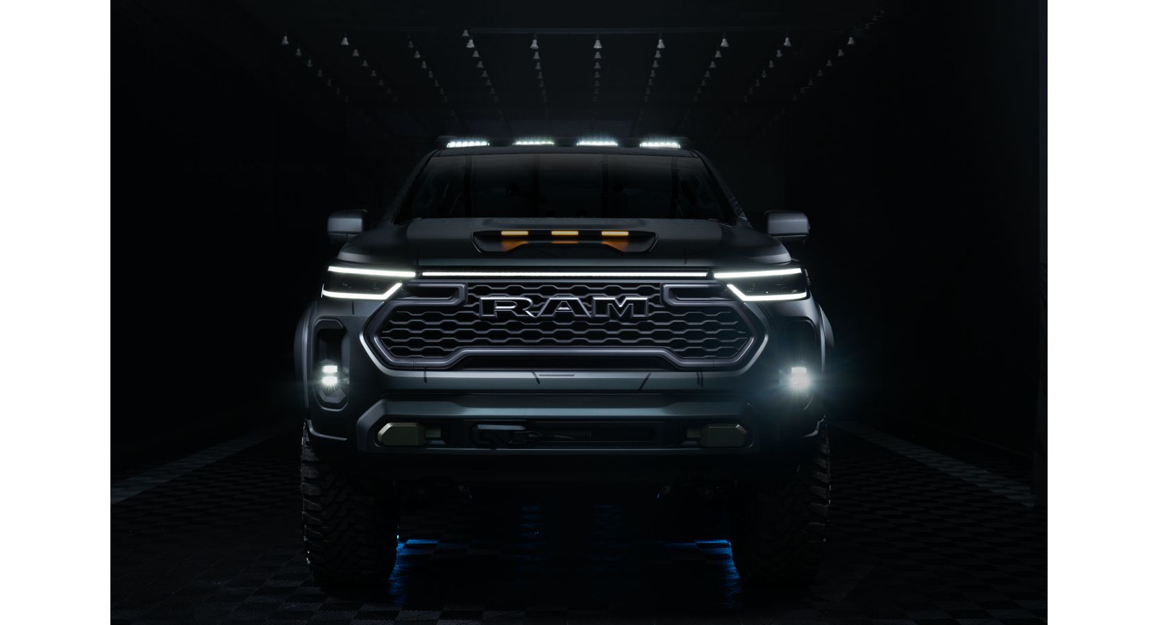 El Nightfall Concept destaca por su diseño imponente y su identidad RAM, reflejada en cada detalle. En el frente, una imponente parrilla con el nombre RAM calado domina la escena, enmarcada por una firma lumínica LED que recorre la parte superior y conecta con los faros también en tecnología LED.