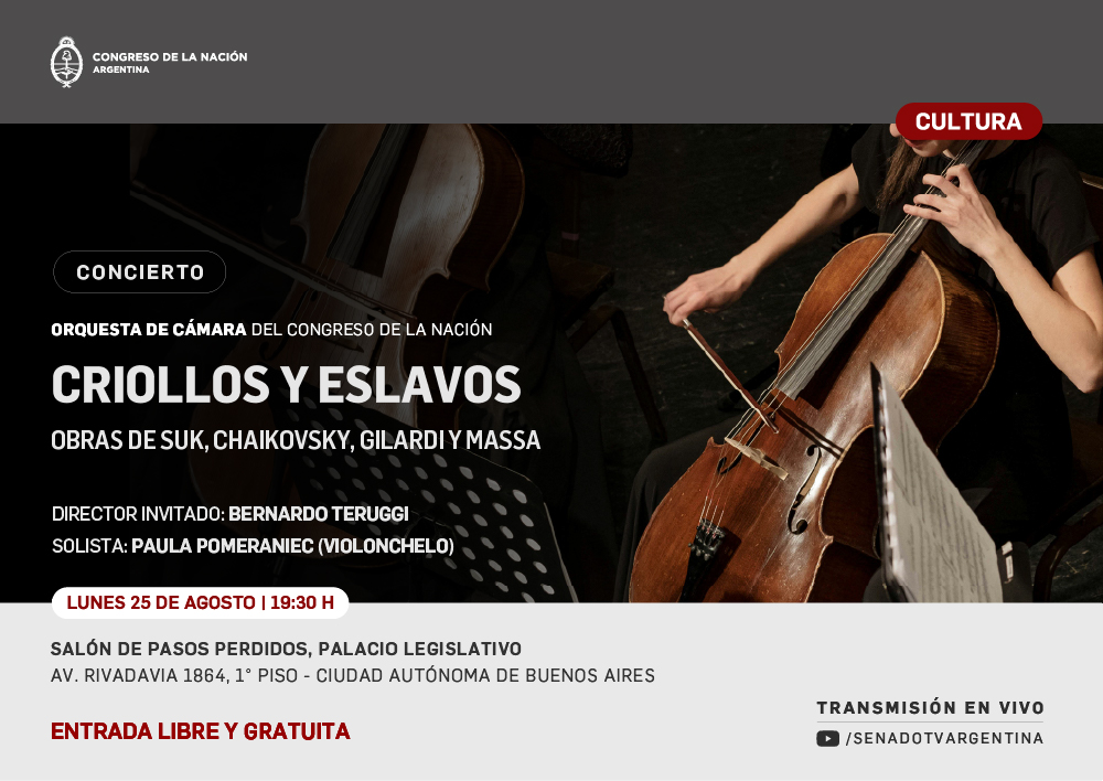 La Orquesta de Cámara del Congreso de la Nación presenta su sexto concierto de este año y quinto de la temporada oficial 2025 este lunes 25 de agosto a las 19:30 en el Salón de Pasos Perdidos del Congreso —Av. Rivadavia 1864, CABA—, con entrada libre y gratuita. Asimismo, se podrá ver en directo por el canal de YouTube del Senado de la Nación.