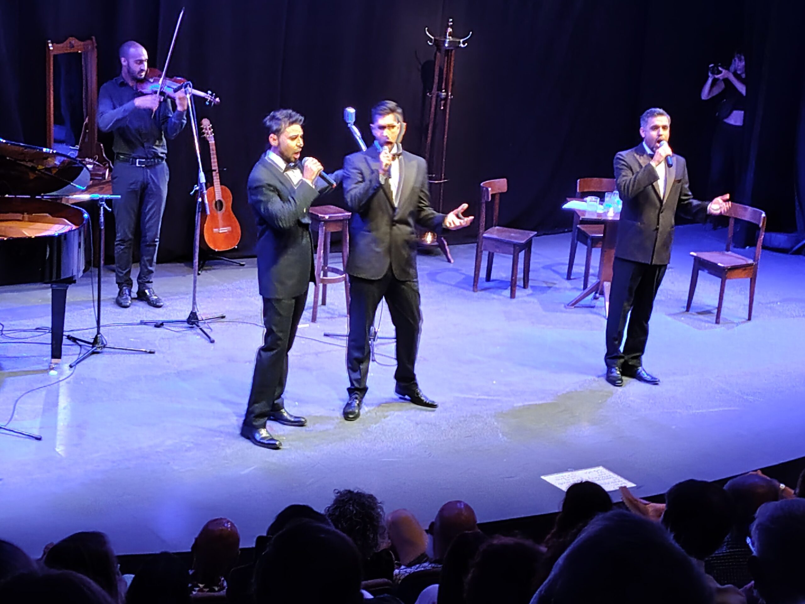 Ante una platea prácticamente llena, con distinguidos looks y arriba de un escenario ambientado para la ocasión (mesita, tres sillas, pequeñas velas encendidas, un perchero y espejo), Quinteros (bonaerense), Fumaneri (entrerriano) y Kahla (rosarino), junto al violinista Simón da Silva Martins y al pianista Ezequiel Nicolás Dalairac, presentaron un repertorio ecléctico y “con una estética lírico-popular accesible”, como decía el atractivo programa de mano.