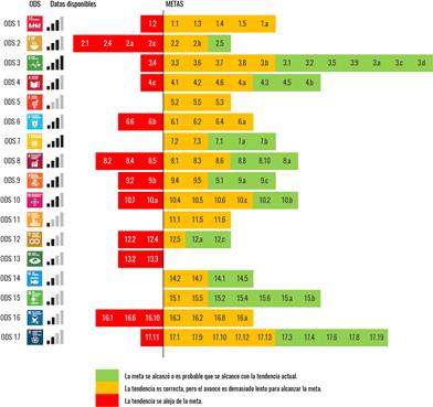 Según la CEPAL, sólo un tercio de las metas planteadas en los ODS para América Latina y el Caribe está en camino a alcanzarse con las estrategias impulsadas hasta el momento. Para los dos tercios, se necesitan acciones de política para lograr las metas, ya sea porque se necesita acelerar la tendencia positiva observada (46% de las metas) o para revertir el estancamiento o retroceso observado (22% de las metas).