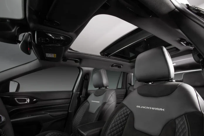 Además, incorpora en el interior tapizados y materiales exclusivos para esta versión: combinando cuero con alcántara y costuras en contraste con bordado “Blackhawk” y la tela interior de techo es color negro.