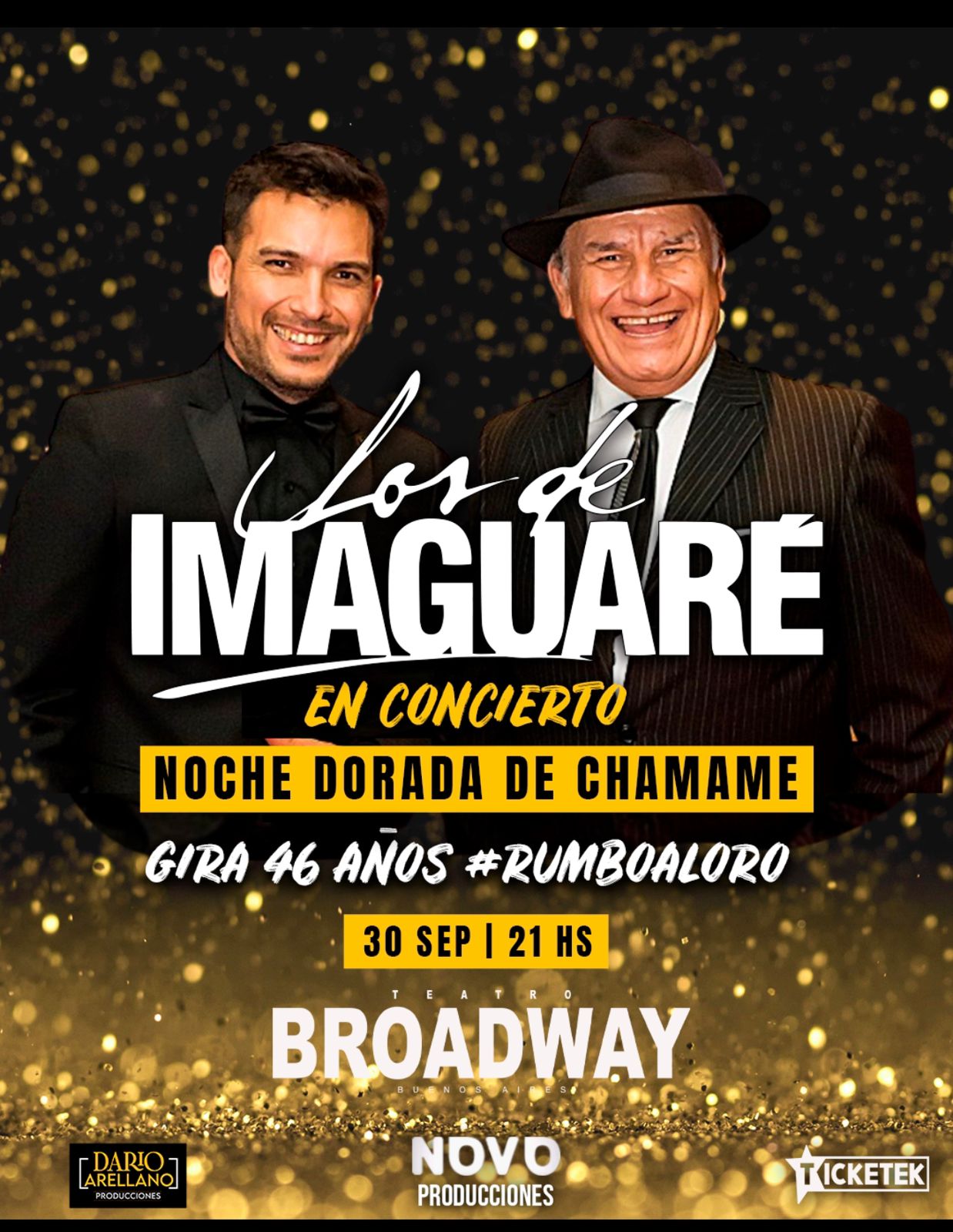 En el marco de su Gira Nacional 46 Años “Rumbo al ORO” con su música, canto, danza” y una Gran Producción Artística, se presentan el sábado 30 de septiembre, a las 21:00 hs., en el teatro Broadway, Av. Corrientes 1155, con entradas en Venta por Ticketek y en las Boleterías del Teatro.