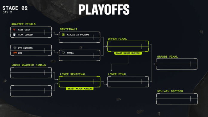 FaZe Clan llegó a los playoffs sin mucho esfuerzo, pero ahora deberá estar atento, ya que en esta segunda fase perdió contra cuatro de los otros cinco equipos clasificados. A su favor, los partidos ahora se disputarán en formato MD3 (mejor de 3), lo que le da la oportunidad de demostrar la experiencia que tiene por ser el equipo con más participaciones en Majors.