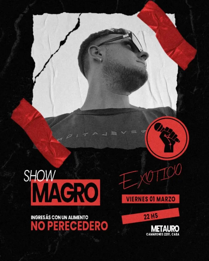 El artista y compositor argentino Magro anuncia su primer show del año para el próximo 1 de marzo en Metauro (Camarones 2201, CABA). La cita es a las 22:00 hs. y la entrada será un alimento no perecedero que será donado al comedor comunitario de Plaza Garay de Constitución.