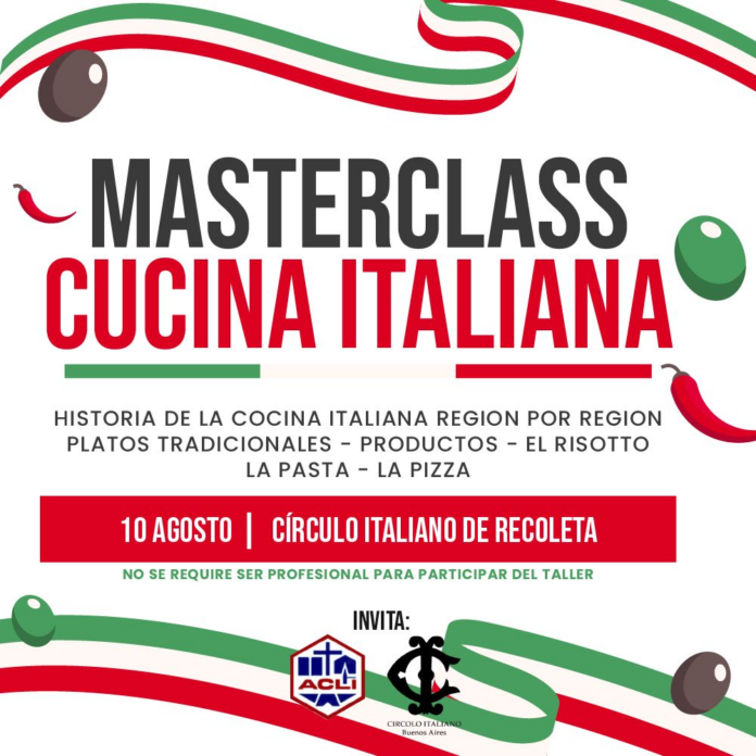 En el evento, organizado por ACLI (Associazioni Cristiane Lavoratori Italiani) y el Circolo Italiano de Recoleta, se recorrerá la historia de la cocina italiana, platos típicos y tradicionales de cada región. Además, se mostrarán todos los secretos para la elaboración de risottos, variedad de masas para pastas, pastas rellenas, pasta design, pastas del sur de Italia, variedad de salsas y pizzas estilo napolitanas y romanas. Además, como broche de oro, los participantes podrán degustar los platos elaborados en la clase. IMPORTANTE: