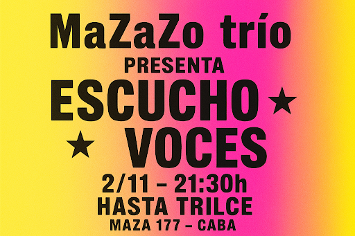 El próximo domingo 2 de noviembre a las 21:30h, el escenario de Hasta Trilce será el punto de partida para un nuevo y conmovedor proyecto vocal: “Escucho Voces”, el espectáculo debut de MaZaZo Trío, integrado por las talentosas artistas Natalia Martínez, Cecilia Zabala y Victoria Zotalis.