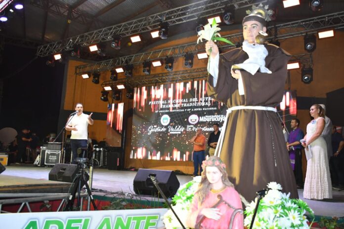 Seguidamente también entraron por el pasillo central, Ex Combatientes en Malvinas portando la Bandera de Ceremonia, para luego dar paso a la imagen de San Antonio de Padua, patrono de la localidad, junto a la actual Pareja Nacional del Chamamé, Erika y Marcelo Aguirre. Ubicaron las imágenes a un costado del escenario, desde donde acompañarán las 3 veladas del evento, y fue el momento donde los locutores Myriam Fleitas y Jorge Hamberger, tomaron la palabra para dar la bienvenida al °56 Festival Provincial y 20° Festival Nacional del Auténtico Chamamé Tradicional.
