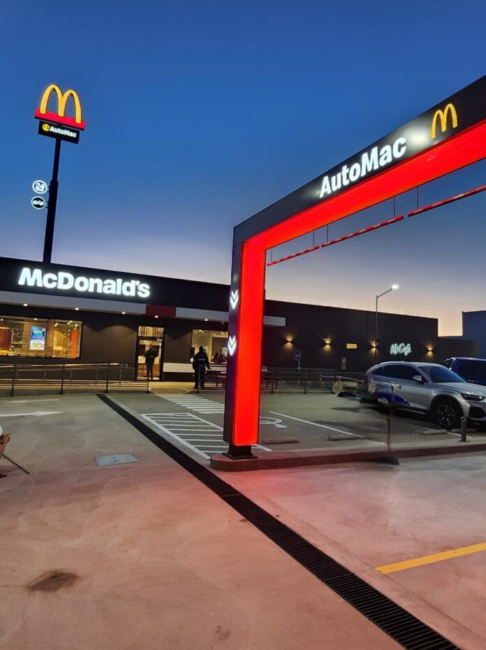 La propuesta del nuevo local también incluye un AutoMac doble senda, “side by side”, que permite atender dos vehículos en simultáneo, agilizando el tiempo de cada cliente. Con 400 m² cubiertos y capacidad para más de 130 personas, ofrece también McCafé con servicio Open 24 horas (viernes y sábados), un sector exclusivo para delivery, cargador para autos eléctricos, playland y tecnología de última generación: kioscos de autogestión, personalización de pedidos y cartelería digital.
