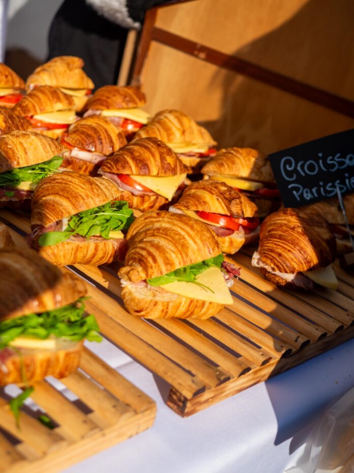 Platos principales y acompañamientos: Quiches de champiñones, Sandwich de focaccia, Ensalada de salmón ahumado y verdes, Sandwich de ojo de bife , Ostras frescas, Tabla de quesos finos con frutas secas y mermeladas, Salchichas alemanas con toppings, Mollejas al disco. Todas, opciones disponibles en los diversos stands.