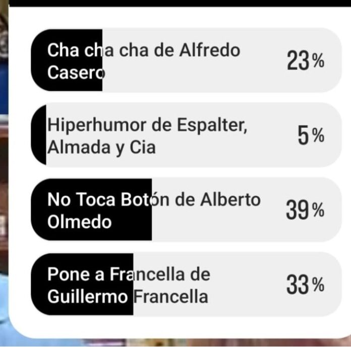 Le preguntamos a la gente cual es el programa que mas le gustaba ver para reírse un poco y olvidarse de los problemas un par de horas. No Toca Botón de Alberto Olmedo fue el mas votado con el 39% de los votos. El programa de Olmedo tenia todo para hacerte pasar un buen rato, desde el sketch del Manosanta que recibía a la Nena (Adriana Brodsky), pasando por Rogelio Roldan y culminando con el momento de Borges y Álvarez, donde Olmedo y Javier Portales desplegaban todo su talento para hacernos reír sin parar.