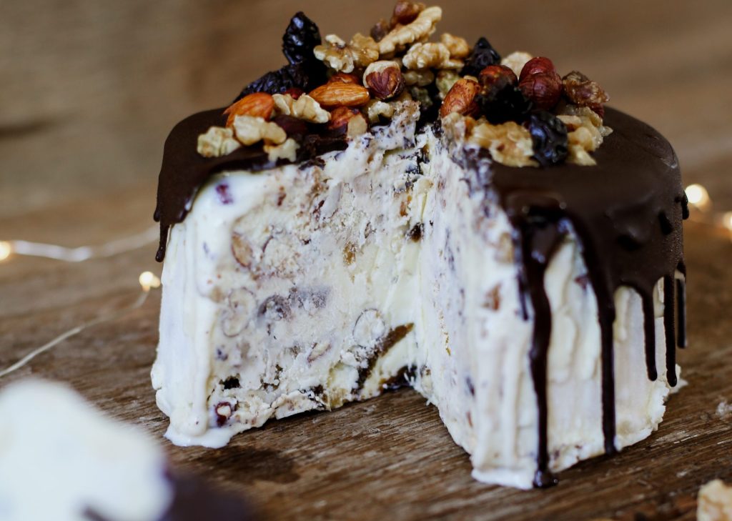 Se trata de 1 ½ kg de helado de crema avainillada, rellena con frutos secos seleccionados: avellanas, almendras y nueces. También tiene higos y ciruelas y un baño de hilos de chocolate.