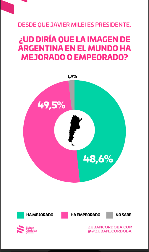 Según datos de la consultora Zurban-Cordoba, el 49,5% de los argentinos cree que la imagen del país, desde que Javier Milei es Presidente, a empeorado en el mundo. Sin embargo, un 48,6% piensa totalmente lo contrario.