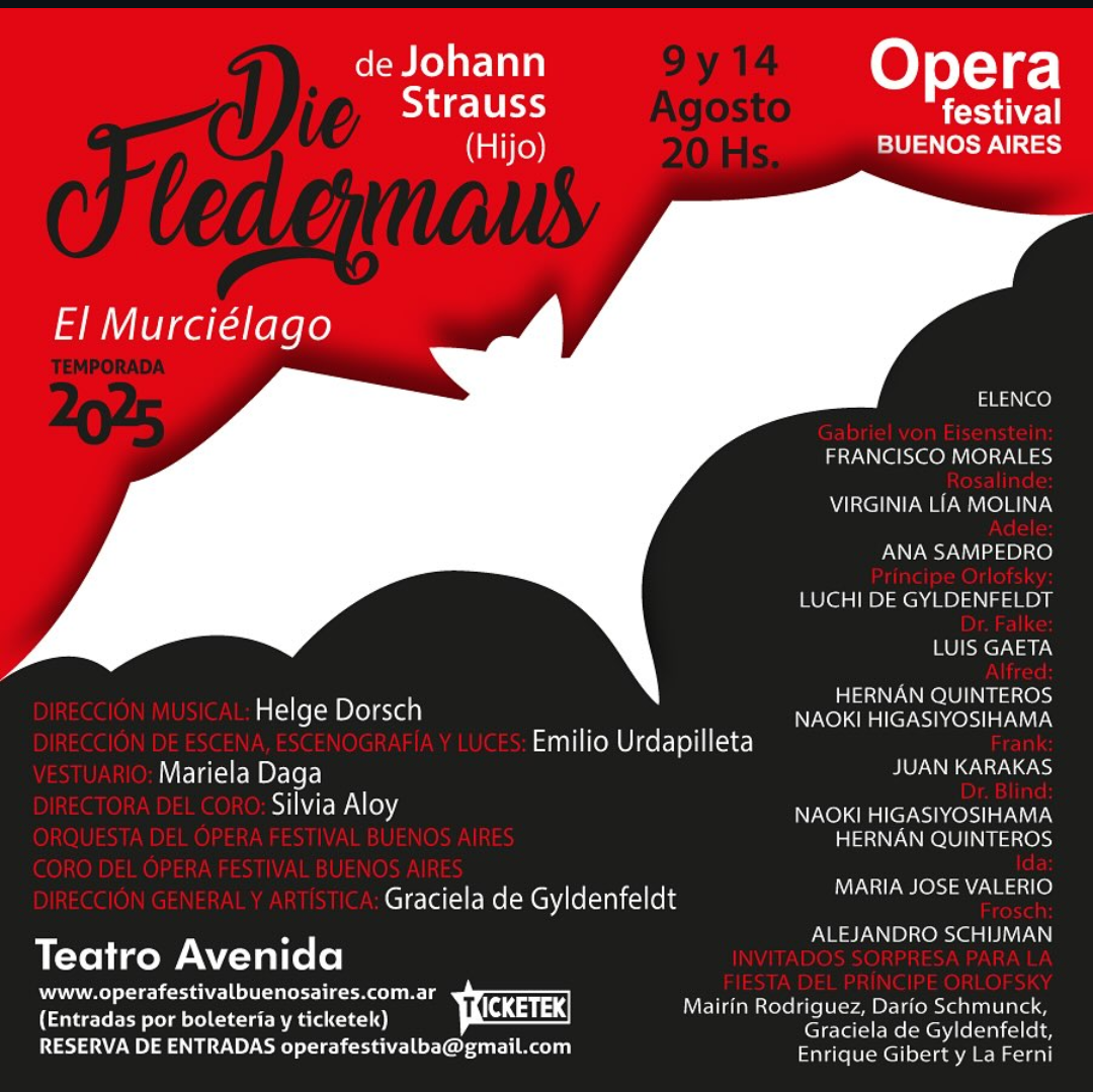 En el marco del 10° aniversario, el Ópera Festival Buenos Aires (OFEBA), presentará “El Murciélago” (Die Fledermaus) en el Teatro Avenida, avenida de Mayo 1222, CABA.