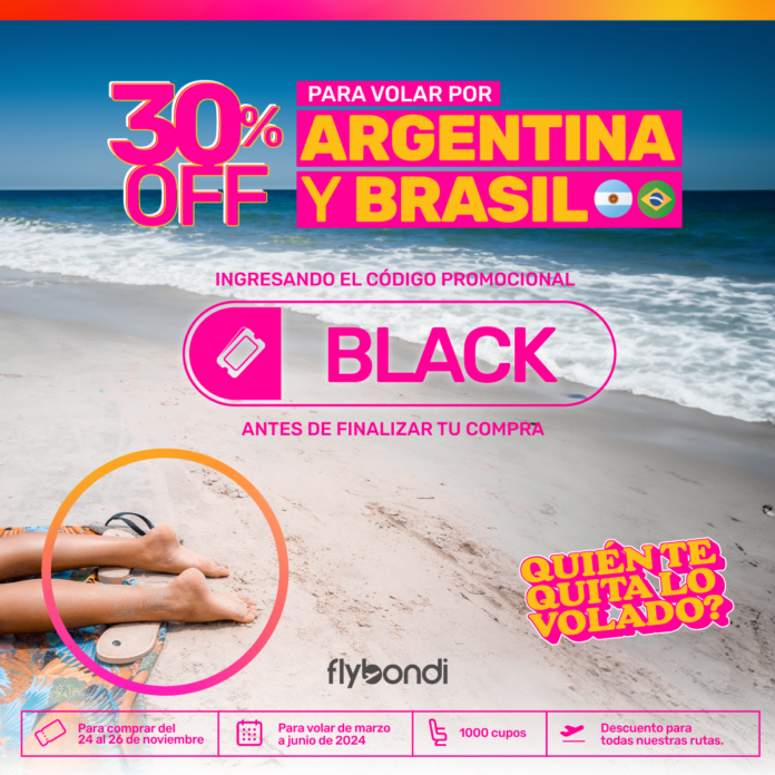 A partir del viernes 24 y hasta el domingo 26 de noviembre ingresando a la web de Flybondi con el promocode BLACK se accede a un 30% de descuento en la compra de todos los tickets. También es válido para los socios de Club Flybondi.