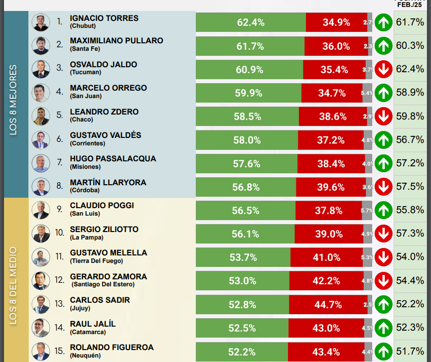 Los tres gobernadores mejor valorados de este mes por sus co-provincianos son: Ignacio Torres (Chubut) liderando con un 62,4% de aprobación, seguido por Maximiliano Pullaro (Santa Fe) con un 61,7%, y en tercer lugar Osvaldo Jaldo (Tucumán) con un 60,9% de imagen positiva. Los gobernadores peor calificados del mes de marzo de 2025 son: en último lugar, Axel Kicillof (Buenos Aires) con un 41,3% de imagen positiva, seguido por Jorge Macri (CABA) con un 41,5%, y luego Gustavo Sáenz (Salta) con un 41,9%. El Jefe de estado que más creció comparado a nuestra medición de Febrero fue el Gobernador Maximiliano Pullaro (Santa Fe) (+1.4%), mientras que Axel Kicillof (Buenos Aires) fue quien más cayó (-2.5%).
